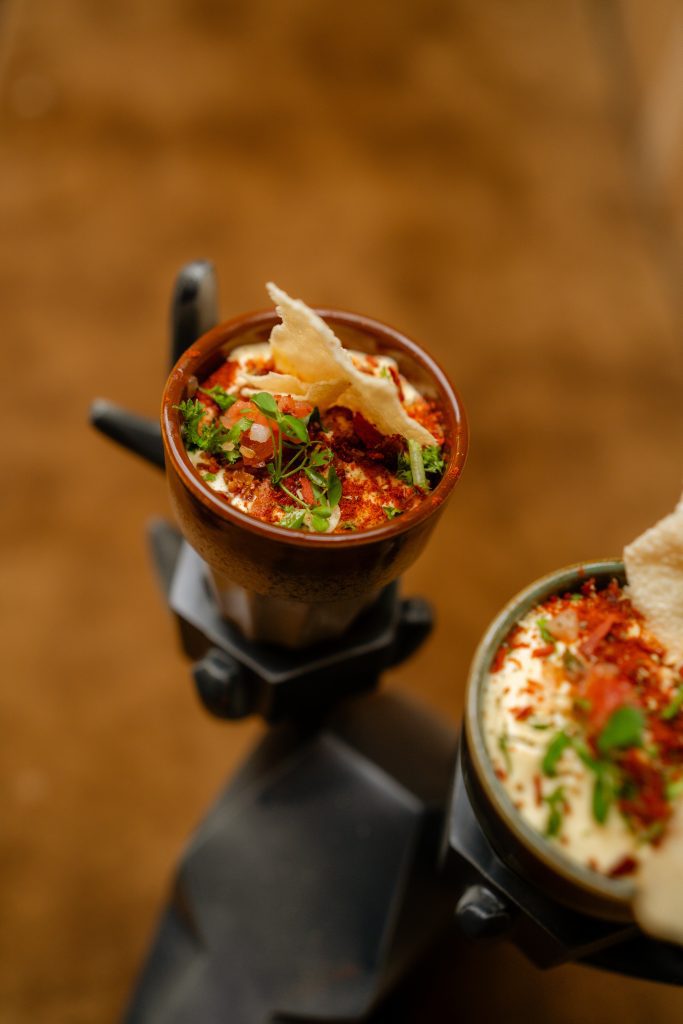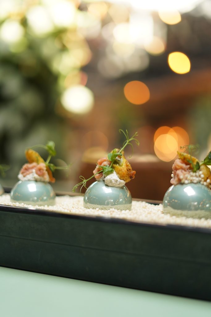 Pani puri l Gevuld met Hollandse garnaaltjes en Granny Smith, geserveerd met een crème van bieslook.